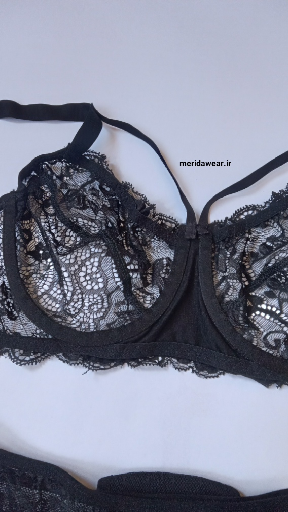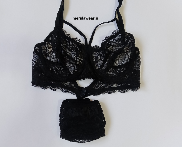 ست شورت و سوتین فنردار تمام گیپور هارنس دار قابلیت تنظیم اندازه داره یک لایه دارای سه قزن دو تایی تک رنگ مشکی جلوی شورت گیپور و پشت کار تور طرح دار کار شده